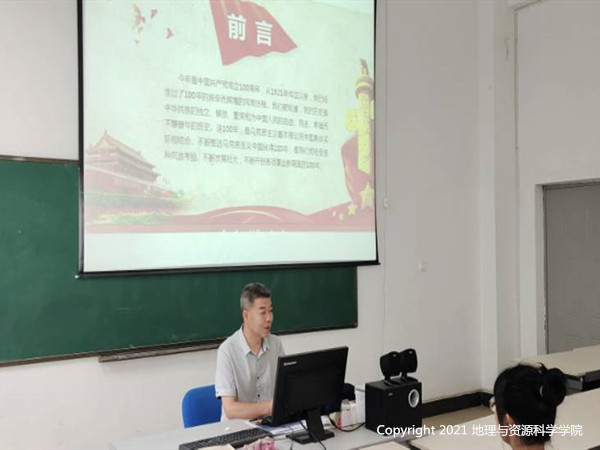 6月3日下午2:30,地理与资源科学学院副院长胡晓东深入联系班级,在三实验楼105教室为20级1班同学讲“学党史、悟原理做中国特色社会主义建设的接班人”党史学习教育专题党课。