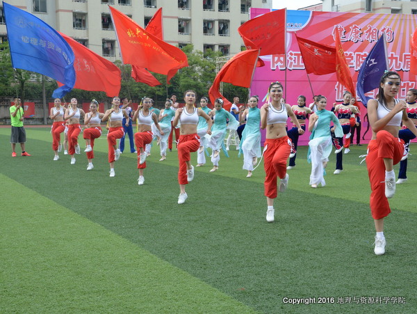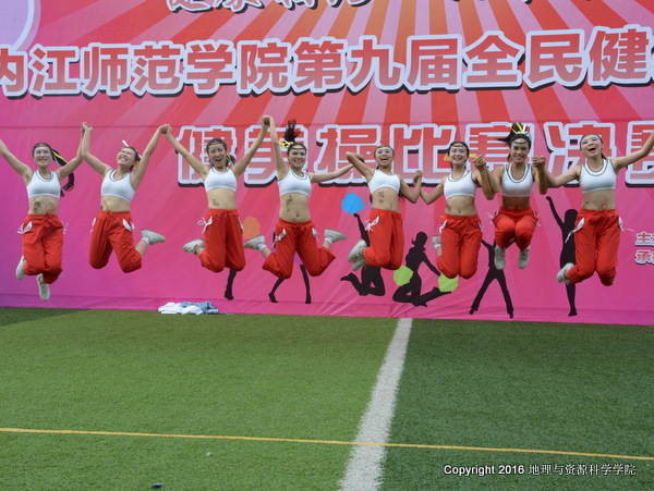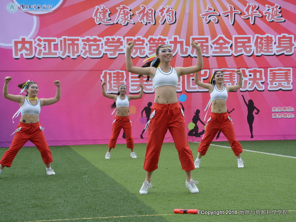 5月23日下午4点10分,第九届全民健身运动会健美操决赛在田径场拉开帷幕。我院健美操队员入场便摆出劈叉托举等高难度动作,伴随着音乐她们不断变换着队形,动作整齐划一,有力有度。比赛中,把健美操的力量演绎得淋漓尽致,队员们灿烂的笑容更是征服了全场观众,她们的飒爽英姿和朝气蓬勃几乎把全场的气氛带到了最高潮。她们用身姿诠释青春的奔放,用热情编织青春的浪漫,结尾时高举并响亮的喊出我院为母校建校60周年送上的对联——上联:青春活力庆华诞,下联:满园芬芳托朝阳,横批:桃李天下。