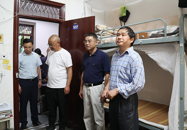 从校园西区到东区,陈晓春一行先后走访了学生宿舍第七幢、第一食堂、体育学院、美术楼以及东区球场等区域,重点对前期督查所发现的问题位点进行再次查看,检查各问题位点的整改情况。在检查过程中看到,学校的学生宿舍整洁,食堂准备室环境干净、食材新鲜,校园的绿化、道路的卫生情况整体较好。