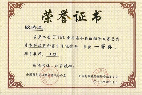 4月15日在北京外国语大学举办的第二届ETTBL全国商务英语翻译大赛总决赛结果于近日揭晓,外国语学院学子欧若兰喜获本科笔译组全国一等奖、林倩倩获本科口译组全国三等奖,内江师范学院荣获大赛“优秀组织奖”。