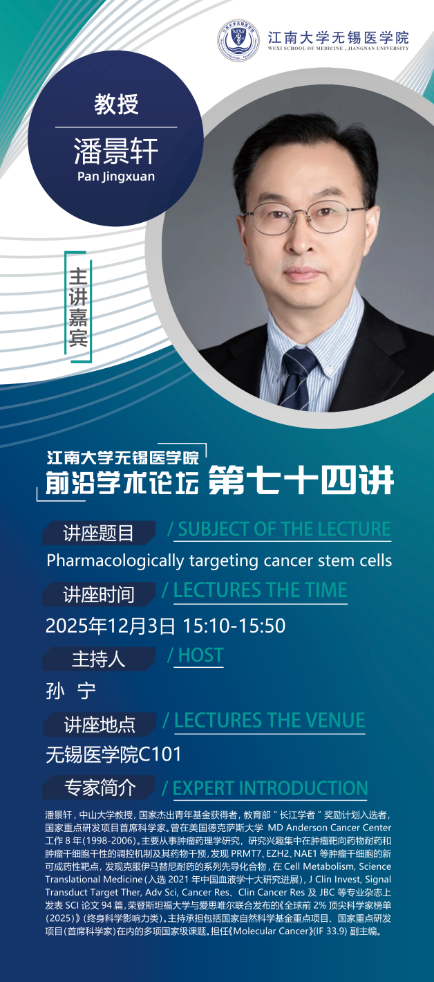 嘉宾简介:中山大学教授,国家级人才计划入选者,国家重点研发项目首席科学家。曾在美国德克萨斯大学MD Anderson Cancer Center工作8年(1998-2006)。主要从事肿瘤药理学研究,研究兴趣集中在肿瘤靶向药物耐药和肿瘤干细胞干性的调控机制及其药物干预,发现PRMT7、EZH2、NAE1等肿瘤干细胞的新可成药性靶点,发现克服伊马替尼耐药的系列先导化合物,在Cell Metabolism, Science Translational Medicine(入选2021年中国血液学十大研究进展), J Clin Invest, Signal Transduct Target Ther, Adv Sci, Cancer Res、Clin Cancer Res及JBC等专业杂志上发表SCI论文94篇,荣登斯坦福大学与爱思唯尔联合发布的《全球前2%顶尖科学家榜单(2025)》(终身科学影响力类)。主持承担包括国家自然科学基金重点项目、国家重点研发项目(首席科学家)在内的多项国家级课题。担任《Molecular Cancer》(IF 33.9) 副主编。