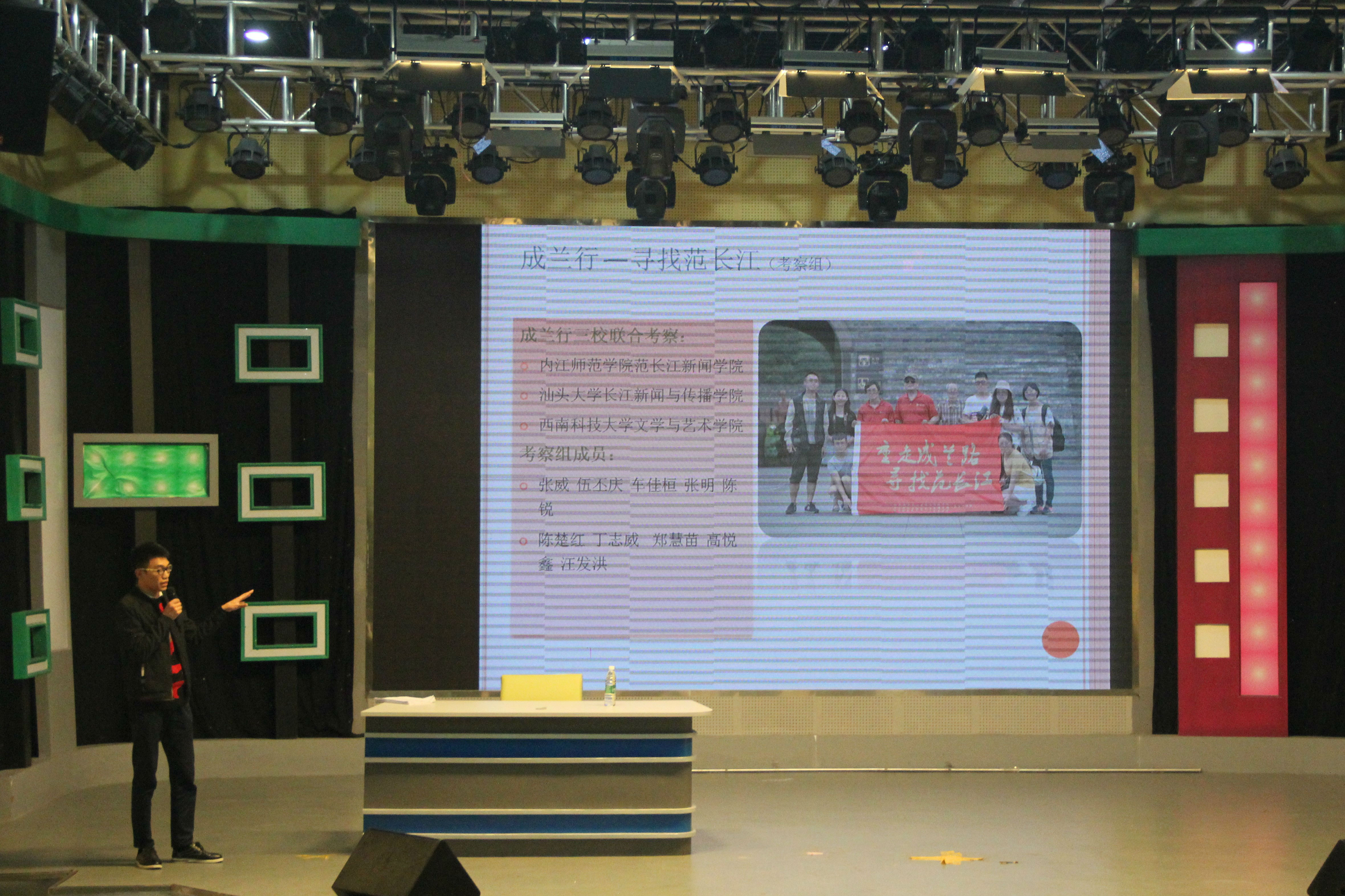 11月6日晚七点整,“成兰行-寻找范长江”的分享交流会作为“缅怀长江情,大写新闻人”记者节主题月的开幕式于第三实验楼演播厅顺利举行。交流会主讲人为我院13级优秀毕业生陈锐。