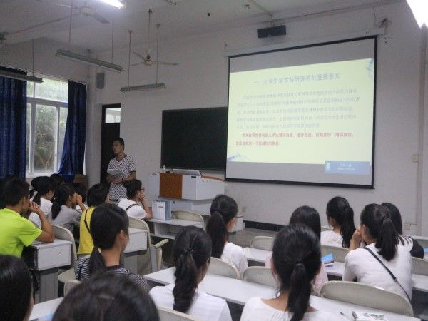 首先,杨老师讲解了此次讲座的目的是为了使新一届的同学们更加了解生科学院各种竞赛状况。杨老师从生科院学术科研竞赛情况、学生竞赛体系、创新创业比赛这三大方面开始介绍。第一,生科院的应用技术专业有丰富的实验实践资源,同时拥有四川高等学校“特色农业资源与利用”重点实验室、“长江上游鱼类资源保护与利用”四川省重点实验室等多个实验室。第二,我们的学生竞赛中有“大、小挑战杯”包括文科论文、社会实践调查报告大赛、自然科学类学术论文大赛、科技发明制作大赛等众多高质量的比赛,新同学们不愁自己的才华无处施展。杨老师鼓励新生们要积极参加各种比赛,并且要早做准备,有想法就要用行动去实现它的价值。紧接着,杨老师还在创新创业比赛中介绍了生科院创新创业教育情况、向新生展示我院的大创项目在全校项目数量中占比非常高,并且已有多位在校同学开始已经开始了自己的创业实践。其中杨老师还对15级3班徐桂林同学的蜀洋水产公司做了详细的介绍,提升了同学们的创业兴趣。最后,杨老师介绍了“天府杯”创业大赛的奖项设置,详细分析了在申报中各个项目的申报条件、要求和范围,申报程序的注意事项和资助政策的设置。