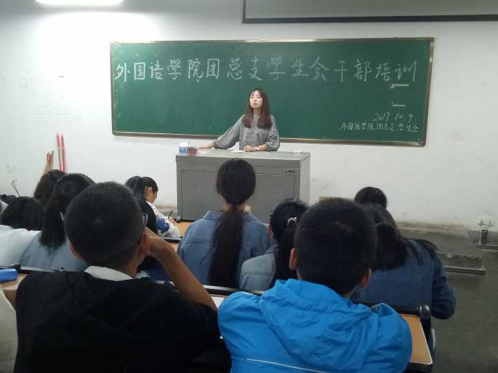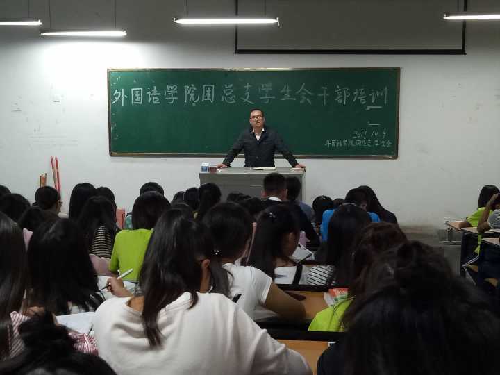 2017年10月9日18:10分,三教106教室,外国语学院团总支书记曾乾辉老师为我院学生会全体成员及2017级各班班长团支书召开了“外国语学院团总支、学生会干部培训大会”,就如何当好"学生干部"为同学们进行专题讲解。