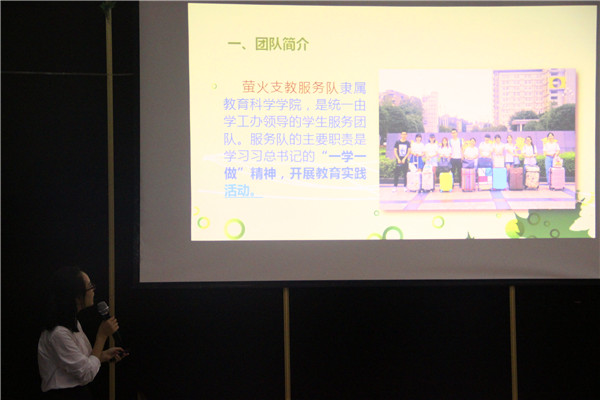 出席汇报会的嘉宾有教科学院党总支书记杨梅,叙永支教服务团队指导老师季晓华。校学生会实践部以及各二级学院实践部代表和教科学院百余名17级新生参加此次社会实践成果汇报会。19点整,主持人张艳红宣布汇报会正式开始,各个团队进行详细的汇报。其中,星火团队汇报人向巧以实践活动中易拉罐斜立场景,让全场观众近距离体验他们的三下乡活动。星火与其他三下乡团队一样,充分利用所学的专业技能,开设简笔画、手工课、书法课等一系列课程。星火还开展红色文化主题活动,缅怀革命先烈,感恩老一辈革命家,从中学会珍惜现在的和平时光。星火还积极开办素质拓展活动,从中锻炼孩子们的团队意识和协作能力,并在活动过程中与孩子们交流,关注他们的心灵健康。晨风志愿服务队则以一段小视频,让全场观众体验他们的三下乡。他们下社区,看望空巢老人,为腿脚不便的老人们打扫卫生。在与老人们的接触中,他们深深感受到了老人们坐在自家门口守望时的孤独。晨风汇报人余盈昆谈到:我们每个人心中都应该装着一颗爱心,趁着父母长辈都在,常回家看看。感爱志愿者服务队、叙永支教服务队以及月岩4心理辅导队,都在实践地区开展团队特色活动,给当地的文化卫生,社会公益,科技,社会调研等多方面都有所帮助,尤其给当地匮乏的教学带去积极的影响。这几支队伍以各自的特色,将他们的实践过程娓娓道来,在第二学术报告厅掀起阵阵高潮。随后,个人分散社会实践代表李玉玲分享了她的三下乡实践感受,将此次三下乡汇报会拉近尾声。