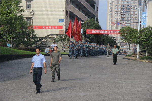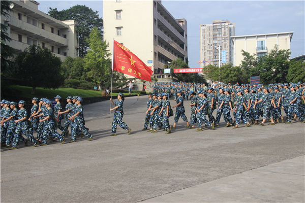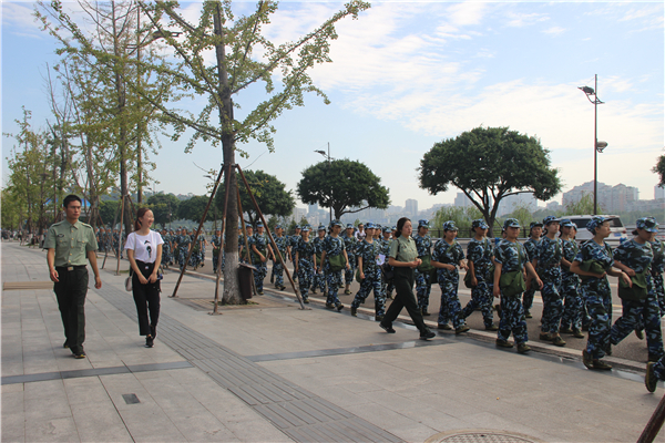 早上八点半,全校2017级新生在内江师范学院田径场集合完毕,等到首长的口令之后,途径兰桂大道、大千路、兴隆路,绕行学校周边的沱江经西区图书馆又回到田径场,全程6公里。