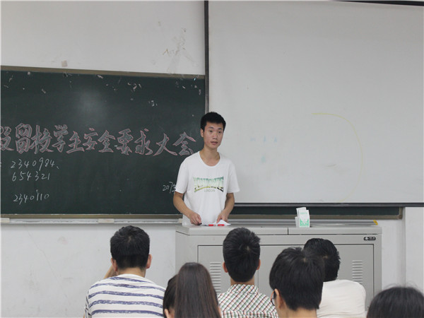 会议伊始,陈陆老师对暑期留校学生提出一系列安全要求,强调留校期间需注意的相关事项。陈老师重点强调了暑假期间人生财产安全问题,并告知留校学生我校保卫处以及桐梓坝派出所的联系方式(保卫处:2340984、654321派出所:2340110),并对此次暑期留校做了相关安排。随后,吴书记上台对暑期留校同学提出了具体要求。其中再次强调了暑假期间留校同学们的人生财产问题,并让留校同学定时向家中打电话报平安。同时,吴书记也提到在暑假期间由于天气炎热,禁止到江河游泳。会议最后,吴书记让留校同学中参加“三下乡”暑期社会实践的同学留下,随后我院学生会实践部部长吕健超阐述了一系列“三下乡”期间的安全问题。最后,吴书记上台总结,希望参加“三下乡”的同学在社会实践期间要有安全意识、礼貌意识以及团队意识。