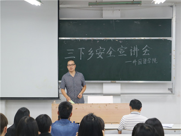 为提高我院各“三下乡”队伍队员的安全意识,6月25日19:30,我院在五教南101举行了“三下乡”安全宣讲会,外国语学院党总支副书记李仰锐,辅导员曾乾辉以及全体“三下乡”成员参加了此次宣讲会。