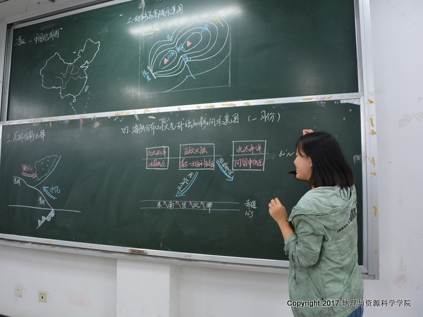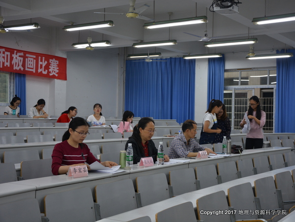 6月4日早8点半地理简笔画和板画比赛在五教南101举行,本次比赛的评委有院长袁天凤教授、王昌勇老师、李宏芸老师。参赛选手现场抽取比赛题目,并在黑板上利用规定时间完成三幅地理简笔画图及一幅板画图。无论是中国疆域轮廓图、昆明准静止锋示意图、城市热岛效应示意图、水循环示意图,还是欧洲疆域轮廓图、非洲疆域轮廓图。参赛选手都手拿粉笔在黑板上一笔一划的勾勒着,或快如疾风、或慢如闲游、或轻如层云、或重如千钧。起从手到笔落,选手们都行云流水般演绎的得心应手。我院的李双和王利两位同学凭借着扎实的基本功和沉着的现场表现,高效率的完成了四幅板画作品,给其他选手带来了莫大的压力。赛后王昌勇老师点评到,同学们在板画的作画过程中还存在着许多问题,如粉笔冷暖色调的搭配及应用问题、做图过程中云团气团的统一规范问题、地图弯曲凹凸的细节问题等。这些都反映出同学们的紧张或者是平时的训练不够,希望大家在平时的学习中努力提高。袁天凤教授着重跟同学们讨论了昆明准静止锋降雨在冷气团上还是在暖气团上这个学术争议问题。她强调在以后的教学过程中要多跟学生分析学术争议问题,不要用大多数人认可的观点去教授学生,要多方面的去讲解,保证学术的纯净性与独立性。