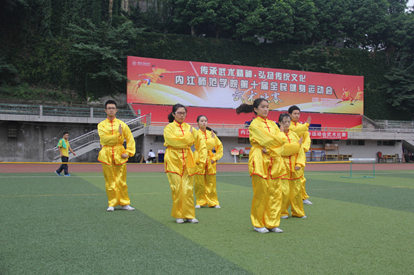 2017年6月3日上午8时,内江师范学院第十届全民健身运动会武术比赛在田径场隆重举行。在内江师范学院学工部副部长商林威宣布开幕后,我院武术方队精神抖擞、意气风发。我院学子将本着赛出风格、赛出水平、赛出精神的原则,尽显我院学子的精神风貌。