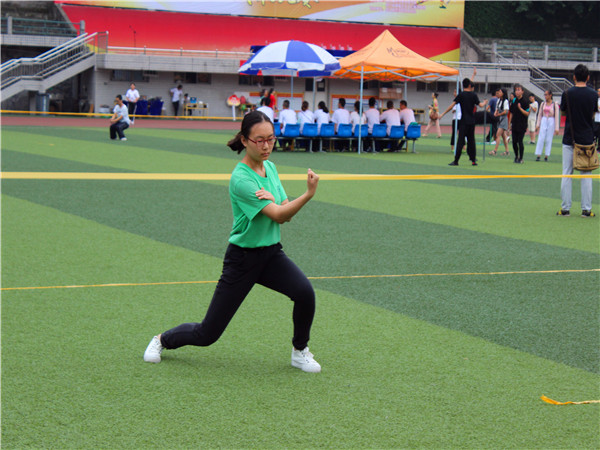 伴着阵阵凉风,全民健身运动会武术比赛也拉开了序幕。6月3日早8:40,田径场热闹一片。全体参赛人员均在场地等候检录。我院共参与了三项比赛,分别是个人南拳、集体长拳和集体跆拳道。