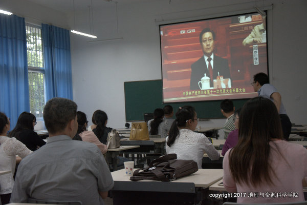 8点50时党员老师和党员学生在教室等待开幕式直播,9点开幕式直播正式开始。会上中共四川省委书记王东明代表中国共产党四川省第十届委员会向大会作报告,王东明表示,经过五年不懈努力,四川经济持续健康发展、民生不断得到改善、社会大局和谐稳定、干部奋发有为。在此此次观看中,党员认真的做好笔记,记录王东明同志在大会上的报告。