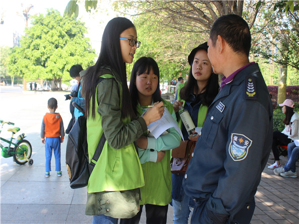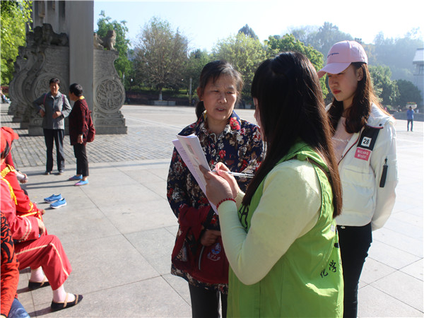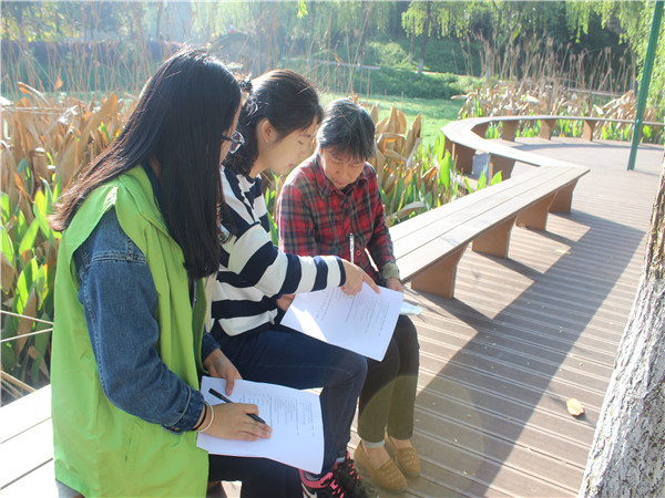 上午8:30,志愿小分队抵达大千公园,在实践部部长吕健超的安排下,小分队分成四个小组,分头向路人宣传。本次活动主要以问卷调查的形式展开的,参与此次问卷调查活动的中老年人居多,大家都很配合小分队志愿者,积极参与活动。