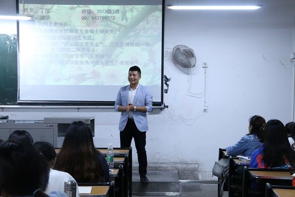 交流会一开始,13级1班的刘雪梅同学就上台分享了自己的考研经历。刘雪梅同学认为,要想考研成功,就必须先端正自己的心态,明确自己的目标,同时踏实奋进,不畏艰难。而13级2班的卢全梅同学认为,要想考研,首先就必须先树立一个明确的目标,短时间如果没有目标,就先脚踏实地努力学习,在奋斗的道路上逐渐明晰自己的方向。13级3班的丁泓同学则认为,考研成功的关键在于三点:认真复习,积极交流与经验分享。与卢全梅同学同为2班的张丽同学随后上台发表了自己的见解,她认为,要注重复习方法及复习时间的安排,在政治方面要注重实习,不要放弃。与张丽同学的观点相似的是13级1班的唐子涵同学,唐子涵同学认为,考研之前要努力做好一切准备,要对自己有信心,对学校有信心,自信、坚持和专注,就是考研成功的秘诀。最后,13级3班的郑兴华同学上台发言,他建议了一些适合法学生考研的学校,同时让同学们慎重考虑培训班 并且推荐了一些实用的复习资料。交流会的最后,孟发兵老师为此次交流会做了最后总结。