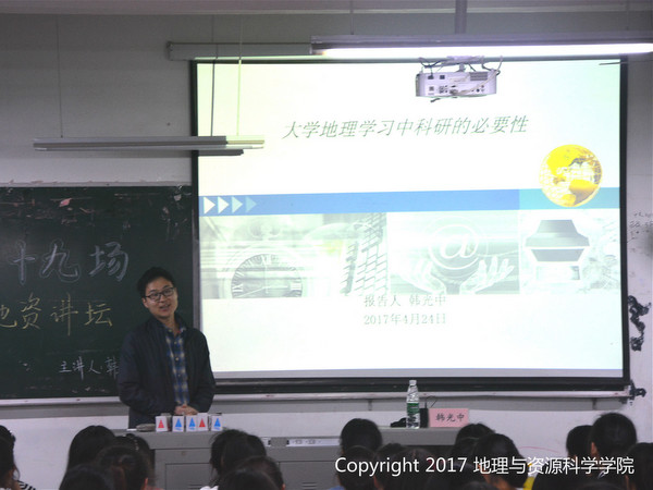 为给我院师生提供学习交流平台,激发学生科研兴趣并引导我院学子重视科研。4月22日晚7点,我院邀请韩光中老师于一教105举行题为“大学地理学中科研的必要性”的学术讲座。参加此次讲座的人员有我院14级、15级、16级学生。