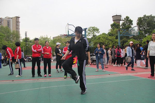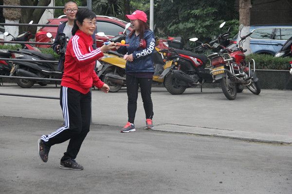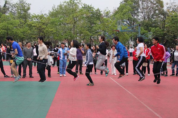 比赛开始前,我院老师与建筑工程学院的老师就开始了准备活动,他们满怀信心、合作默契。当比赛的哨声吹响,建筑工程学院的老师便齐力甩动手中的大绳,绳中的8位运动员一同跳起。甩动着的绳子发出“呼呼”的响声,令人眼花缭乱。在旁加油的同学一起数着运动员们跳过的数目,声声洪亮整齐,如同他们跳绳的步伐整齐有力。跳绳比赛结束,我院以60个的数目,夺得教职工跳大绳比赛第六名。