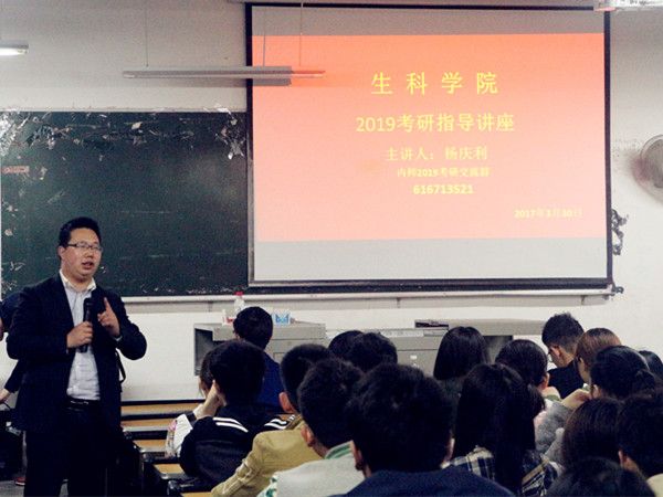 本次讲座我院请来了启航的杨庆利老师为大家解疑答惑,一开始杨庆利老师就提出了“我们为什么要去考研?”“考什么?”“怎么考?”等问题,引导同学积极思考,紧接着杨庆利老师以“如何高薪就业为目标去考研?”为主题,为学生们分析如何科学、理性和有计划地规划考研。杨庆利博士将考研分为两个阶段,一是科学备考、二是精确报考。随后,杨老师为我们分析了生物专业能够考研的专业及院校,他强调,选择考研专业和院校时要做出冷静合理的分析后再进行选择。讲座的最后杨老师为同学们分析了“考研能带给我们什么?”并鼓励我们能考研的就一定要考,不能考研的创造机会也要考。