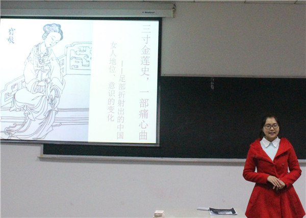 接下来的答辩为叶玉梅的《寸金莲史,一部痛心曲》。论文通过对金莲起源兴衰等方面的研究折射出中国女人地位意识的变化。答辩过程中她用手和图片演示了缠足的过程,折射出缠足的痛苦。论文的研究价值着重于女权意识。黄全彦老师接着提出了千年来女人为什么喜欢缠足的问题,陈景元老师和马振君老师分别提出缠足束缚女人和展现女性美的观点,对论文进行了补充。