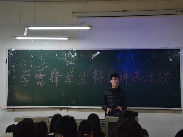 首先,张斌同学播放了有关雷锋事迹视频以及他和其他志愿者一起去践行“雷锋精神”一些点滴的精彩视频。,视频中他和其他志愿者走进居家养老服务中心,帮助老人打扫卫生,陪他们聊天,为老人带去了精彩的表演。他们义务为小学生辅导作业,与他们做朋友。他们还组织同学一起去河边去捡垃圾,文明劝导路人爱护环境。这只是他和他的小伙伴做的一部分,他们做的更多,也做的更好。接下来,张斌同学给在座的同学分享了他做志愿者的经验和心得体会。同学们在下面认真的听着,并不时就响起热烈的掌声。随后他与在座的同学们一起探讨新时期如何更好更合适的发扬雷锋精神,谋划学雷锋活动计划。最后,张斌同学积极呼吁,希望同学们能加入志愿者的行列,在实践中体会雷锋精神,在行动中发扬雷锋精神,在促进社会和谐发展的同时,让自己也收获了爱与感动。在同学们的掌声中,本次学雷锋学生标兵评选活动圆满结束。