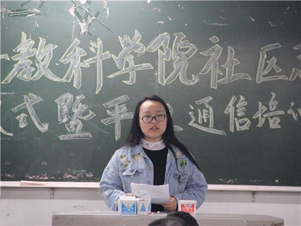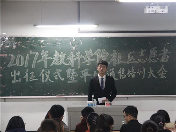 在本学期初,教科学院志愿者团队便开展了招新纳贤,力求为社会做出更多、更好的志愿服务。经过选拔,一股新鲜血液加入了教科学院志愿者团队。为提高志愿者们的服务质量,2017年3月13日,教科学院社区志愿者出征仪式暨平坦通信培训大会于一教105展开。学工办姚鑫老师,团总支副书记蒲佳芝,学生会副主席马帅、伍柳治出席大会。此次培训会面向教科学院全体志愿者以及平坦中心校通信者。