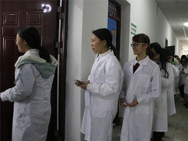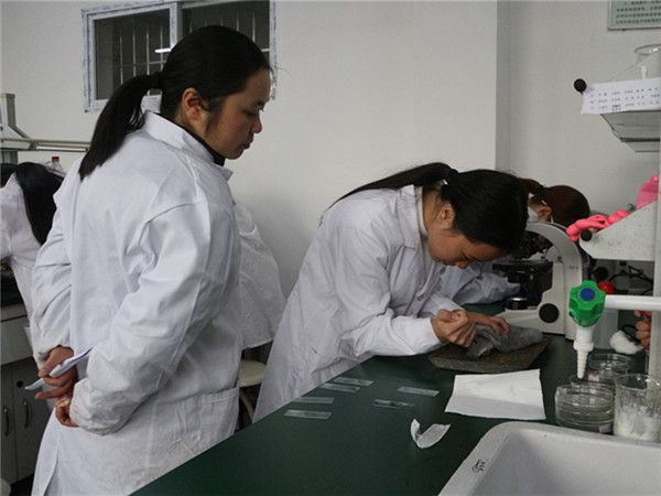 在比赛开始前各班参赛人员早早的来到等侯室,相互进行经验交流、讨论制作方法,两点整,大家按分组有秩序的进入实验室准备开始比赛。在考官宣读比赛规则和评分标准后,比赛开始了,同学们依次走到自己的实验台前,调试着仪器开始做起来,随着时间的流逝,现场气氛变得紧张起来,各参赛选手都娴熟的做着自己的比赛项目,心无旁骛,高度专心地在操作台上争分夺秒,参加叶脉书签的同学用刷子在叶片上快速的刷着,只希望在15分钟的比赛时间内超过对手。制作鱼血涂片的同学,先用针管抽出鱼血,再用新鲜血液制作装片,虽然看上去一项简单的技能,但在这种紧张的气氛下难免有些同学会出现失误而导致涂片失败,他们一次次重新制作装片,老师们都为他们的坚持而鼓掌。制作叶片横切切片的比赛现场,同学们用刀片在叶片上削出一片片切片,在一堆的切片中找出一片薄而不失结构的切片细心制作装片。随着时间的推移,比赛接近尾声,同学们的实验都已经完成,他们反复地检查着自己的实验成果,回忆着操作步骤,努力的找寻自己的不足加以改善,等到宣布实验结束后,才放心的走出了实验室。