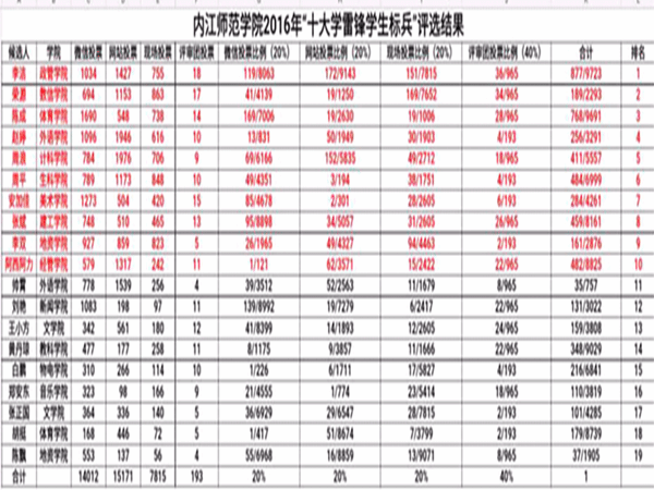 此次投票方式分为了四个部分,分别为:官方微信投票,网站投票,现场投票以及评审团投票,其中评审团由学工部部长郭云东,副部长商林威、王英,校团委老师罗建、吕小英、傅思忆以及各二级学院老师代表组成。经过几天的宣传动员,我院学生周平在官方微信投票,网站投票,现场投票的得票数分别为:789票、1173票、848票、10票,以强有力的好成绩当选为内江师范学院2016年十大学雷锋学生标兵。