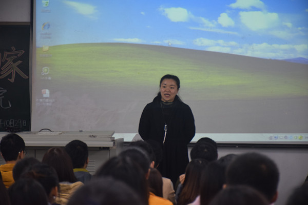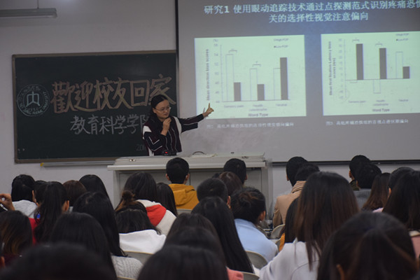 与此同时,在104教室同样在进行中一场精彩的校友交流讲座。这个教室里都是心理学专业的各年级各班的同学,前来的也都是心理学专业的学长学姐。首先,2002级的杨周学姐给大家详细介绍了自己目前的研究领域——“疼痛恐惧”。她从专业心理学知识方面给大家讲解了其中各个研究,并告诉大家做这些研究的重要性,鼓励大家积极做一些自己感兴趣的研究。她的这一段讲解对大家的产生了很大的影响,很多同学跃跃欲试,都说要着手开始准备。