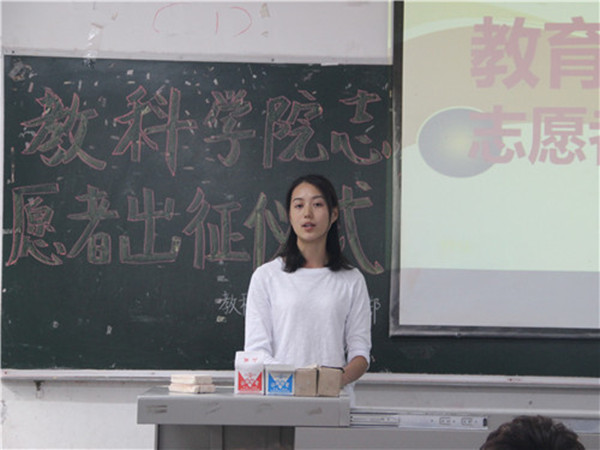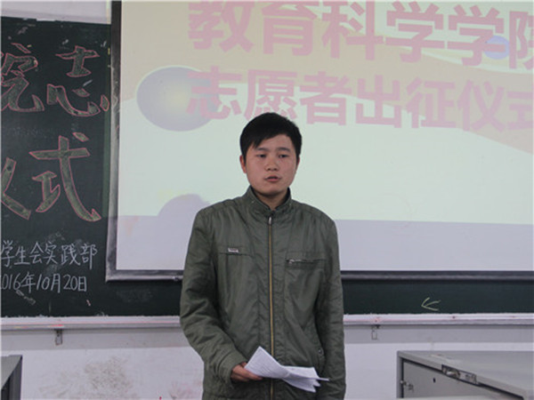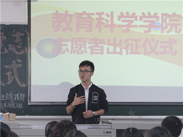 2016年10月20日12点30分,教科学院志愿者出征仪式于一教111教室顺利举行。教科学院学生会副主席马帅、新一届志愿者出席了仪式。实践部干事胡月、向允担任主持。