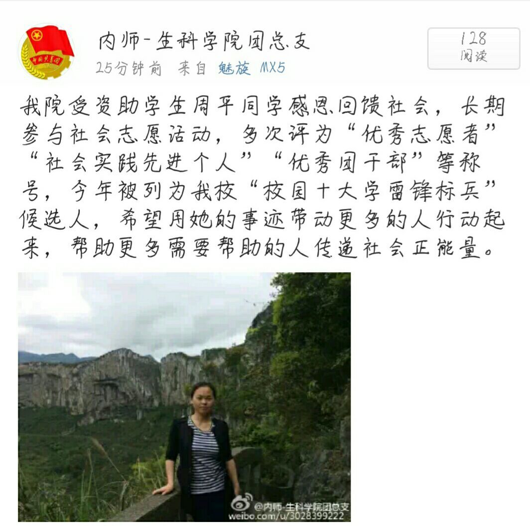 一直以来,我院一大批贫困学生都得到了国家的资助,今年也不例外。而这些受资助的学生,他们热爱学习,热爱生活,在接受社会的帮助时也在用自己的努力来回报社会。其中,作为我校2016年“十大雷锋学生标兵”候选人,我院14级生物科学专业的周平同学最为突出。