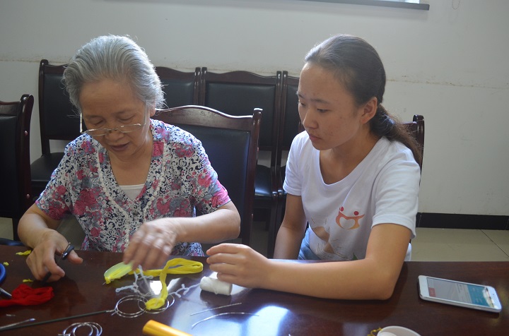 志愿者们给每个老人分发制作工具和所需的材料,并由社工钟帅展示基本的丝网花制作方法。在志愿者的辅助下,老人们开始制作。不一会儿,一些擅长做手工的老人已经率先完成基本的准备工作,志愿者也及时为他们补充材料;而一些年龄偏大和不擅长手工的老人还不知道该如何下手,晨曦队员们就对他们进行了一对一辅助。活动期间,老人们与志愿者们都在丝网花的制作过程中感受到了“自己动手”的成就感。