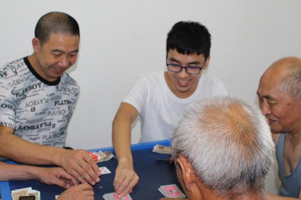 老人们一直给志愿者们道谢,脸上也洋溢着笑容,每位队员都倍受鼓舞。由于一些老人较孤僻,志愿者们决定陪伴老人们玩耍。与此同时,另一批志愿者来到了老人们的活动室,在征得老人们的同意后,加入老人们,并陪他们一起打扑克牌,在牌桌上老人们也不再受年龄的拘束,大家开怀大笑地玩起来。志愿者们和老人亲切的交谈,仿佛认识多年的老友一样,棋牌室里传来老人与志愿者们的阵阵欢笑声。