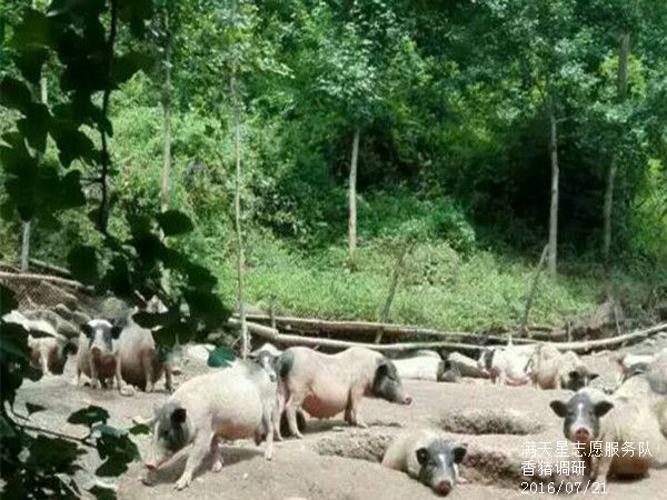 今天是一个阳光明媚的一天,满天星志愿服务队的主要任务是对水磨当地的香猪养殖基地进行调研。2016年7月21日,满天星志愿服务队上午10点到达了水磨镇,已有几百年历史的水墨古镇在震后重建后不久就恢复了以前的热闹。