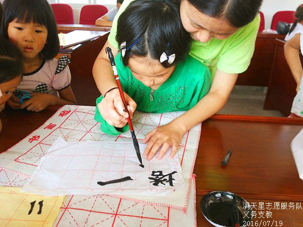 队员们在支教活动中,每天都会有一些不同的活动,虽然每天都会帮孩子们辅导作业,但孩子们更喜欢队员们每天安排不同的兴趣课。在帮孩子们辅导完功课后,队员们开设了一堂钢笔、毛笔课,队员们手把手的教孩子们写字,看着孩子们小小的手拿着粗粗的笔杆在桌子前认真的写字的模样,队员们都很欣慰。但在写了一会儿后,孩子们就开始玩起来了,队员们为了让孩子们能更好的学习、认识钢笔、毛笔,于是开始教孩子们用钢笔、毛笔画画,孩子们对画画总是有一种说不出来的喜爱,于是孩子们渐渐地都加入到了画画的队伍中来了,看着一幅幅孩子们用毛笔画的图画,让人想起了中国的国画。国画总是能给人一种意境美,看着孩子们认真地画画,志愿者们也都纷纷加入,这让课堂变得生动有趣多了。当孩子们拿着一幅幅图画开心地放学回家时,志愿者们今上午的支教活动也圆满结束了。