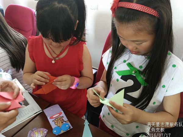 2016年7月17日上午,队员们在辅导完孩子们的功课后,带领孩子们一起上了一堂手工课,队员们拿出了提前在网上买好的折纸,手把手的教孩子们折星星、花篮、大象等等,孩子们对折纸都比较感兴趣,在志愿者的身旁,认真的学习折纸。并让志愿者们折一些好看的动物送给他们。志愿者们都很高兴,孩子们今天格外的听话,也特别的喜欢在志愿者的身边黏着。在折纸结束后,队员们就开始教孩子们画画,一笔一划,可以看出孩子们对画画也是十分喜爱的。看着孩子们画的这么高兴,满天星志愿服务队的队员们也画起了图画,最后,队员们决定这些画的成品以团队的名义送给这些孩子们。