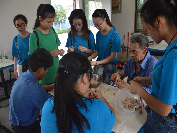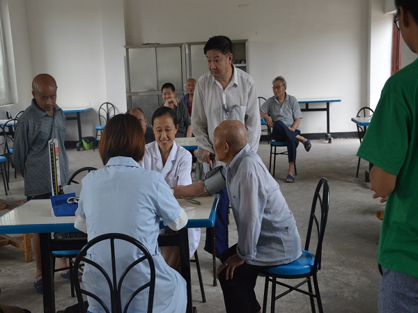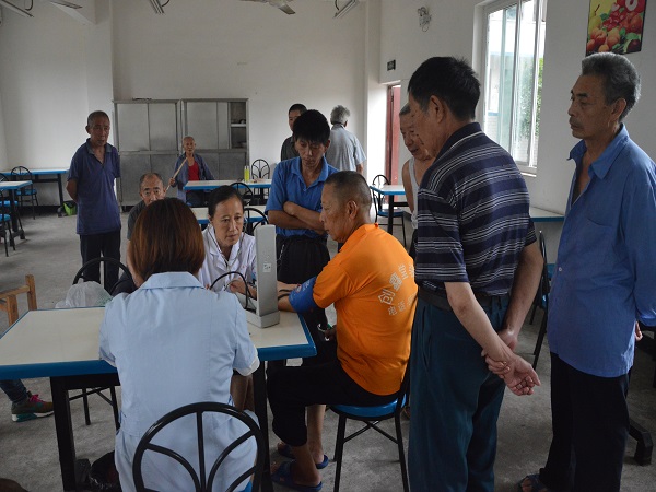 我们和一支医疗队伍一同到此,让他们给老人们做一些简单的体检。在医生准备前期工作的时候,我们的队员在队长的安排下进行场地安排,待之一切准备就绪时,陆陆续续的老人自发来到体检处进行量血压,测心率等等的项目。但是一些老人行动不便,我们的队员们也小心翼翼的搀扶他们来到此处。虽然天气很热,但是老人们都很配合。在他们体检的同时,我们都陪同在身边听医生对老人们的建议,然后记录下来,对不懂的老人仔仔细细的讲解。之后我们和老人们闲话家常,老人们还不时地关心我们的学习与健康。而队员们也精心排练了节目,给老人们唱歌,跳舞,演小品。整个敬老院充满了队员与老人们的欢笑,给以往安静的敬老院带来了不一样的氛围,不一样的欢乐。