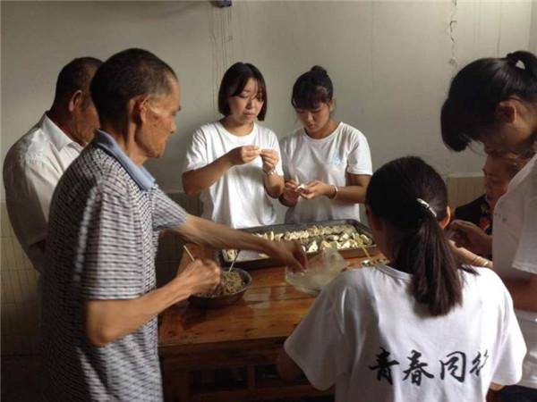 7月15日8点我们青春同行志愿服务队在系办集合准备进行敬老院的活动,活动的主要内容是去白马敬老院给老人们打扫卫生,陪老人们聊聊天,给老人们表演节目和为老人们包饺子、包混沌。