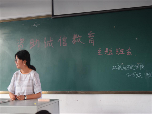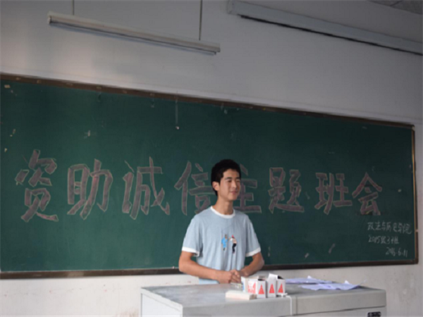 6月8日,我院2015级三个班在三教同时展开以“资助诚信教育”为主题的班会。我院2015级辅导员邱政老师出席主题班会并做了专题演讲。在演讲中,邱老师指出,诚信是大学生出身社会立足社会的根本,也是各个高校学生思想教育的重点之一。我们要树立正确的人生观,才能让自己清白的人生没有一点虚假;我们要树立正确的价值观,不能在物质利益的诱惑下丧失大学生基本的道德素养;我们要树立正确的世界观,加强人与人之间最基础的信任,不讲诚信的人是难以立足社会的。并要求各班班委会要完善各班助学金评定的相关规章制度,严防虚报、谎报情况发生。