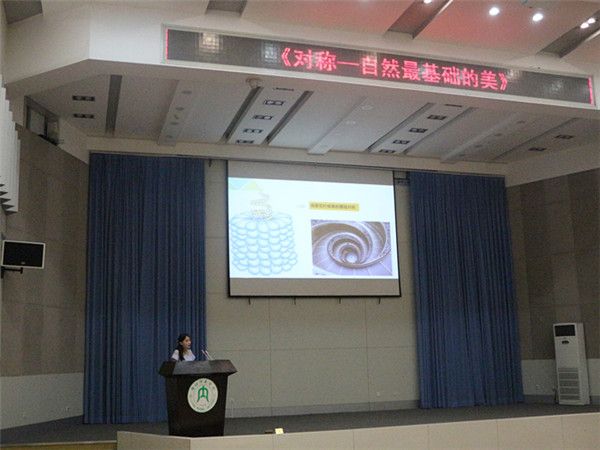 美,每个人都有其独特的定义,有自然美、凌乱美……对称美。对称美,它不同于一般的美,它是自然最基础的美。为探索自然界的对称美,5月30日晚7点在第一学术报告厅,我院14级2班的高悦在“沱江学子”讲坛上作了题为《对称——自然最基础的美》的报告。莅临本次报告的嘉宾有我院学工办主任杨荣金老师、辅导员李清敏老师及高悦的指导老师张志勇老师。