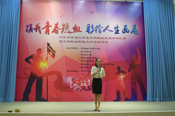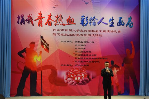 为了培养青年人的奉献精神,激发青年人的献血热情。由内江市献血领导小组、市文明办、市卫计委、内江师范学院、内江职业技术学院、川南幼儿师范高等专科学校、四川省内江医科学校主办,内江市中心血站承办的首届大学生无偿献血主题演讲比赛在我校第一学术报告厅隆重举行。此次演讲比赛以“捐我青春热血,彩绘人生画卷”为主题,参赛者向我们讲述了一个个动人心魄的献血故事。12号选手刘琦和14号选手马思琪代表我院参加了此次比赛,并获得了不错的成绩。