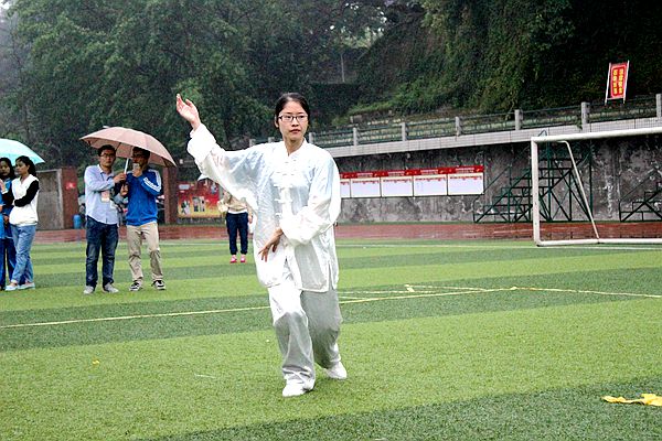 此次比赛中,我院学子总共参加了11个比赛项目。在一场地首先进行的是女子乙组自选刀术。紧接着是长拳比赛,这个比赛队伍全部由我院的女生组成。即使天空下着蒙蒙细雨,她们依旧着装统一,从容淡定的走进比赛场地,丝毫不受小雨的影响,强健有力的拳术配上激昂的音乐吸引了田径场上大多数人的目光。音乐结束后,大家也都纷纷鼓掌,以此来表示对这场精彩拳术的肯定与赞赏。除此之外,其他场地的不同比赛项目也都在如火如荼的进行着。