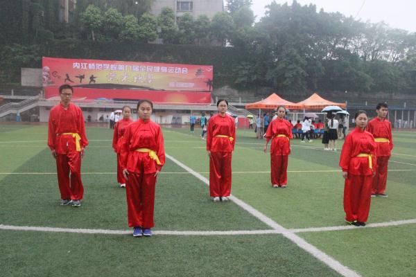 为丰富大家的体育健身内容,进一步促进各学院之间的交流,活跃和丰富校园文化,以促使广大同学在武术锻炼中提高自身素质,使学生在增强对中国传统文化归属感和认同感的同时,继承和发扬中华武术,传播中国尚武精神和感受音乐魅力。5月14日内江师范学院第九届全民健身运动会武术比赛在田径场隆重开幕,我院代表队伍参加本次运动会。