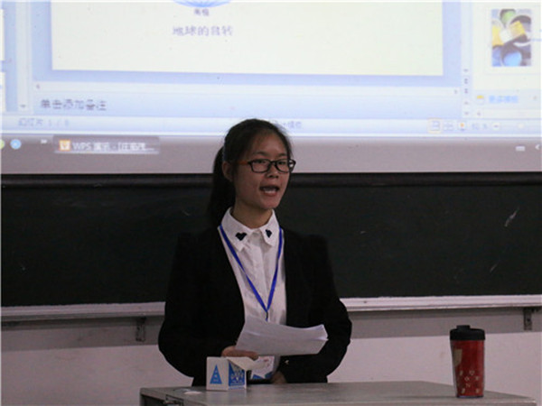 18点30分,在主持人为大家详细介绍了比赛规则后,比赛正式开始。选手们逐一上台开始讲课。站在讲台上,他们展现出了清晰的教学思路、流畅的教学环节,老师范十足。在生动有趣的课件的配合下,选手们富有感染力的语言引导着观众们的思绪,清楚工整的板书也让讲课内容更加简洁明了。不论是学前教育专业、小学教育专业,还是教育学专业的同学,不论是语文、数学知识还是地理知识,选手们紧扣教材、旁征博引,幽默风趣不失严肃认真,善于引导,将知识性、趣味性相结合,充分地展示了自己的专业技能。观众们也积极地配合同学们的讲课,认真回答问题。讲课结束后,评委们对选手进行打分,并指出他们讲课中存在的不足,让同学们受益匪浅。