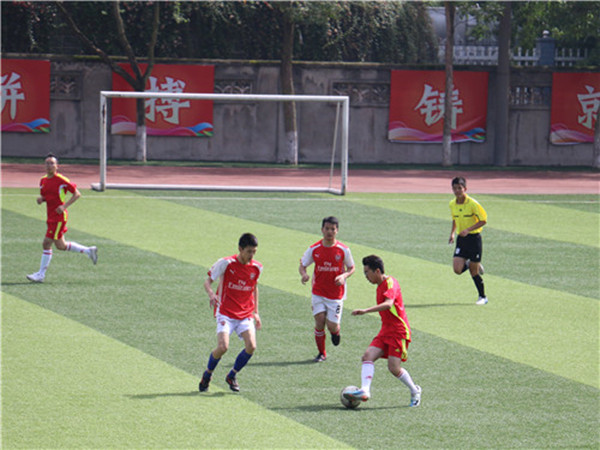 在运动员们经过热身准备后,9点整,一声哨响拉开了比赛帷幕。比赛一开始,教科学院足球队员们便迅速进入状态,面对对方的进攻,队员们抢球、传球、接球,死死地防守,不让其有进球的机会。比赛在几轮比拼后愈加激烈。突然,教科学院球员的一个失误给对方创造了机会,对方球员迅速夺球过人,越过半场后直冲球门,快速地一脚抽射。我方守门员防守不及,让对方抢先夺得一分。教科学院队员们见此也不甘落后,在球场上的奔跑越发迅速。队员们在场上不停地传球,寻找机会发起进攻,最终教科学院队员们以完美的传接球技术扰乱对方视线,踢进一球。而后的比赛,我方多次抢断对方的进攻,防守牢固。赛场上激烈的比拼可谓是惊心动魄。