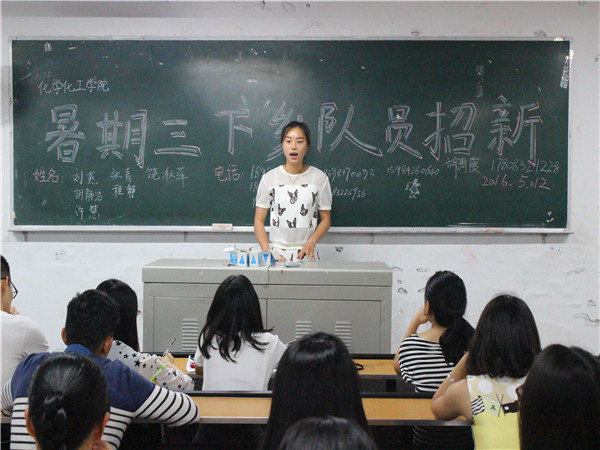 面试正式开始之前,由各队队长向面试者讲诉面试的顺序和要求。随后,同学们按秩序上台,首先作简短的自我介绍。过程中同学们纷纷讲述了自己的特长,怎样为团队做贡献并强调说明了自己能够吃苦耐劳,服从命令尽自己的最大努力带给贫困地区孩子们一份关爱。面试中,还有一位来自体育系的同学,她希望能参与化工学院的义务支教服务队,尝试新的事物、接触不同的人并收获新的成果。面试官们则根据从往年的“三下乡”中遇到的问题和得到的经验向同学们提问,并从中发掘人才。而其他两支队则看中面试者的动手能力,特别是实验技能以及废物利用的能力,当然也要有较强的团队合作能力。