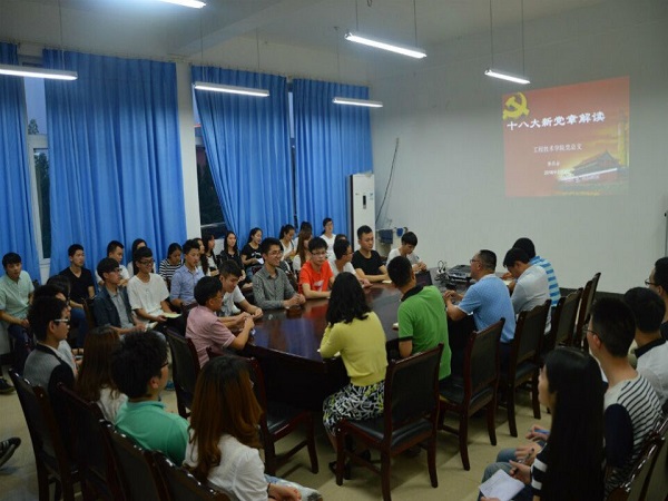 2016年5月2日晚19点,工程技术学院党总支在学院会议室428,开展了以“十八大新党章解读”为主题的党课,工程技术学院党总支书记黎昌金,党总支副书记田波、各学生党支部书记及全体党员、预备党员同学参加了本次党课。