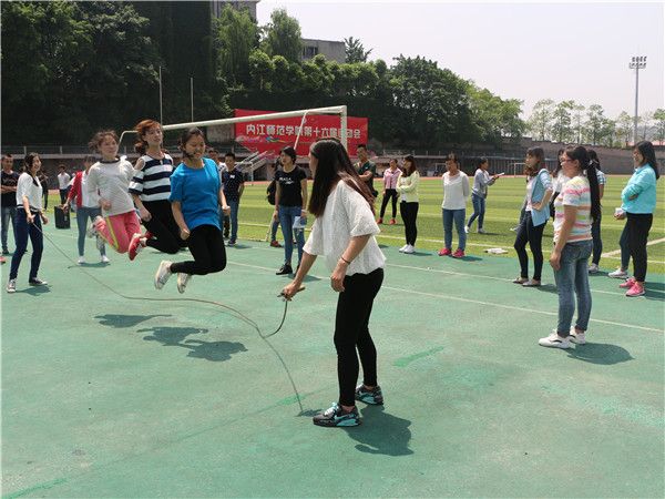 在跳绳赛场上,两人甩绳,三人并排一起跳绳,跳完15个就算完成该项目。比赛中,每个寝室都争分夺秒,争取能一口气跳完,偶尔会有一两个组起跳晚或是被绳子缠住,惹得在场同学哈哈大笑。