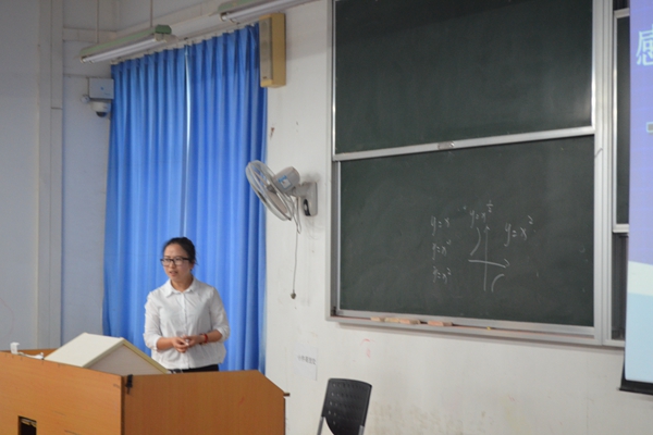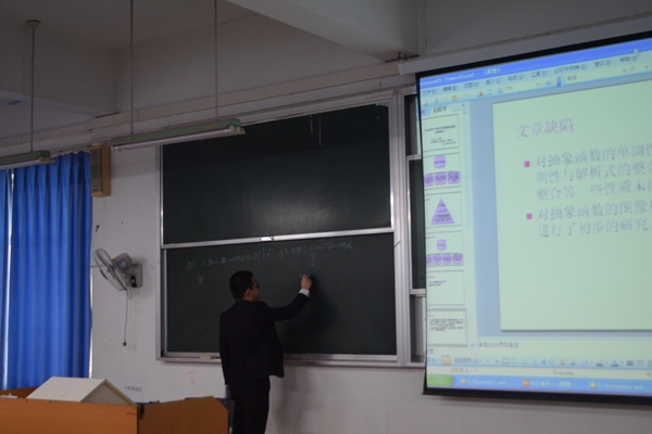此次答辩会主要采用先由学生自己上台讲解自己的论文,再由现场的指导老师提问、交流的答辩形式。各位同学都十分严肃认真地向老师讲述自己的论文,在场老师也十分负责地提问、指导。遇到有不同意见的地方,在场气氛更是活跃,学生密密麻麻地在黑板上书写思维公式,老师则在台下皱着眉头凝视黑板。特别是在一些学术性问题的争锋上,例如抽象函数的简易解法,如何帮助高中学生提升数学的兴趣等,在场气氛更是略带一丝“火药味”,让人看到了老师和学生对此次答辩会的认真与严谨。