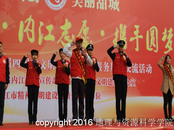 3月18日上午,在内江市大洲广场,一首《世纪的约定》,拉开了志愿服务展示交流活动表彰颁奖仪式帷幕,市委常委宣传部长潘梅等出席了本次颁奖仪式,来自各行各业的近千名志愿者在艾道淋的领誓下庄严宣誓,仪式后志愿者们在沱江边进行了志愿活动。
