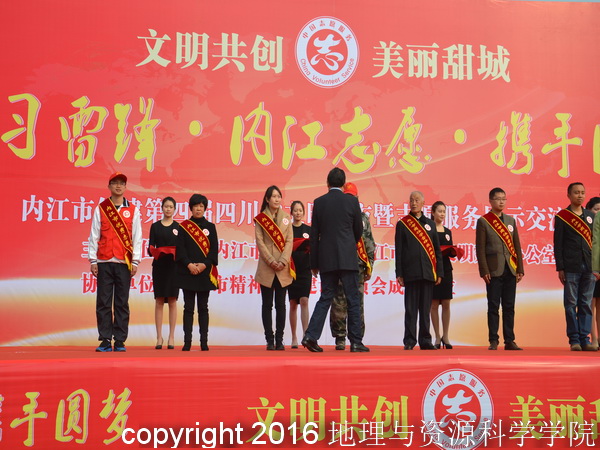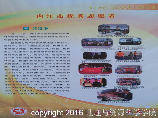 在创建第四届省级文明城市暨志愿服务展示交流活动中,我院爱心传承服务队志愿者艾道淋,荣获“2015年度内江市优秀志愿者”荣誉称号。