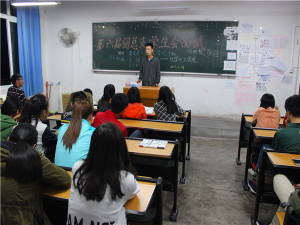 3月24日19:00,化学化工学院第六届团总支学生会干事招新在第一教学楼206、208如期举行。出席本次面试并担任面试官的有团总支副书记张圆,学生会主席肖何彬,副主席陈琴、唐敏及各部门部长。